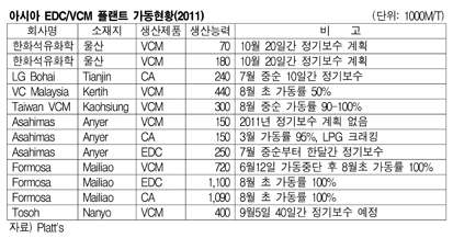 다만, 9-10월 정기보수 계획이 이어지고 있어 일시적인 수급타이트가 우려된다. 표, 그래프: < 아시아 EDC/VCM 플랜트 가동현황(2011) > <화학저널 2011/08/25> |