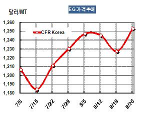 MEG 가격은 8월26일 CFR China 톤당 1253달러로 26달러 상승했다.
