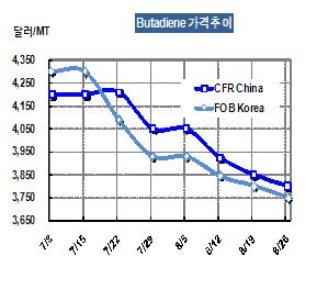 부타디엔 가격은 8월26일 FOB Korea 톤당 3750달러로 50달러 하락했다.