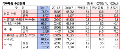 2011년 7월 석유제품 수출액이 꾸준히 증가해  51억8800만달러를 기록하면서 국내 최대 수출품목에 올랐다.