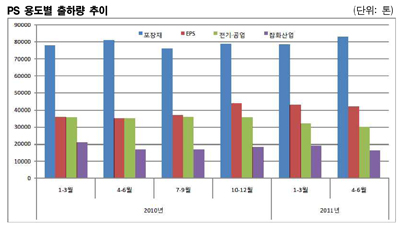 2011년 4월 PS 수입량은 과거 월간 수입량의 최고치인 8126톤을 기록했다. 표, 그래프: < PS 용도별 출하량 추이 > <화학저널 2011/08/30> |