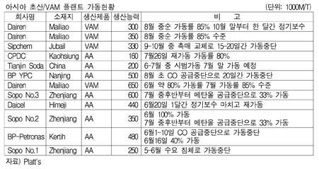 한편, VAM(Vinyl Acetate Monomer) 수급 사정 또한 여의치 않은 실정이다. 표, 그래프: < 아시아 초산/VAM 플랜트 가동현황 > <화학저널 2011/08/31> |
