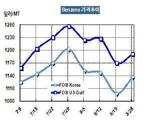 벤젠 가격은 8월26일 FOB Korea 톤당 1136달러로 39달러 상승했다.