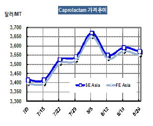 유럽에서는 CPL을 주로 엔지니어링 플래스틱 제조용으로 투입하고 있는데, 최근 자동차 생산이 다시 증가하면서 CPL 가격이 아시아 가격에 근접한 것으로 알려졌다. 표, 그래프: < Caprolactam 가격추이 > <화학저널 2011/08/31> |