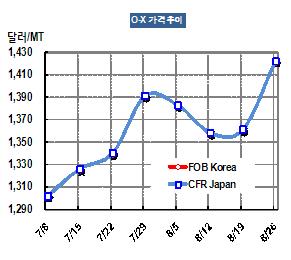 O-X 가격은 8월26일 FOB Korea 톤당 1422달러로 59달러 급등했다.