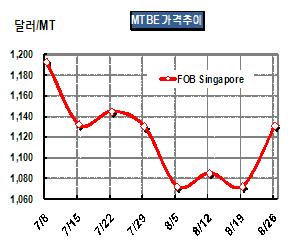MTBE 가격이 8월26일 FOB Singapore 톤당 1131달러로 59달러 급등했다.