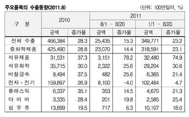 2011년 8월 1-20일 석유화학제품 수출이 23억2200만달러로 25.6% 증가했다.
