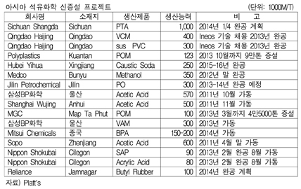Polyplastics도 말레이의 Kuantan 소재 POM(Polyacetal) 플랜트를 9만톤 확장해 2014년에는 총 생산능력을 12만3000톤으로 확대한다. 표, 그래프: < 아시아 석유화학 신증설 프로젝트 > <화학저널 2011/09/02> |