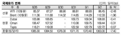 9월2일 108.93달러로 0.41달러 하락 … WTI는 86.45달러로 급락