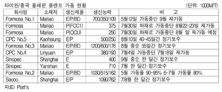 표, 그래프: < 타이완/중국 올레핀 플랜트 가동 현황 > <화학저널 2011/09/05> |