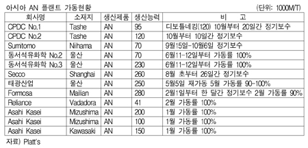 한편, CPDC는 Tashe 소재 No.1 AN 9만5000톤 플랜트를 10월 20일간 정기보수할 예정이며, No.2 12만톤 플랜트 또한 10월 10일간 정기보수를 앞두고 있다. <서지윤 기자> 표, 그래프: < 아시아 AN 플랜트 가동현황 > <화학저널 2011/09/06> |