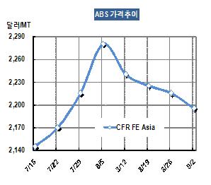 ABS 가격은 8월31일 CFR FE Asia 톤당 2195달러로 20달러 하락했다.