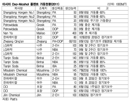 한편, Mitsubishi Chemical은 Mizushima 소재 2-EH 14만5000톤 플랜트와 NBA 9만5000톤 플랜트를 7월25일부터 풀가동하고 있다. <서지윤 기자> 표, 그래프: < 아시아 Oxo-Alcohol 플랜트 가동현황(2011) > <화학저널 2011/09/08> |