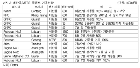 한편, Petronas는 Gebeng 소재 MTBE(Methyl Tertiary Butyl Ether) 30만톤 플랜트를 8월3일부터 풀가동하고 있다. <서지윤 기자> 표, 그래프: < 아시아 메탄올/MTBE 플랜트 가동현황 > <화학저널 2011/09/09> |