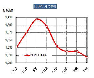 LLDPE 가격은 9월7일 CFR FE Asia 톤당 1304달러로 16달러 하락했다.
