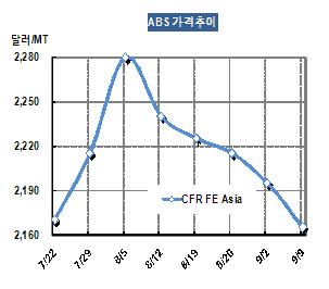 ABS 가격은 9월7일 CFR FE Asia 톤당 2165달러로 30달러 하락했다.