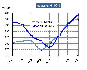 메탄올 가격은 9월16일 CFR Korea 톤당 400달러로 3달러 상승했다.