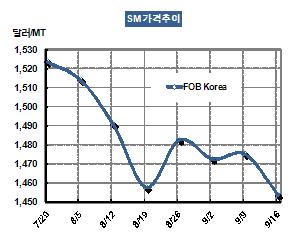 SM 가격은 9월16일 FOB Korea 톤당 1454달러로 21달러 하락했다.