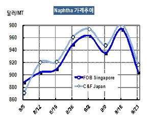나프타 가격은 9월23일 CFR Japan 톤당 916달러로 65달러 폭락했다.