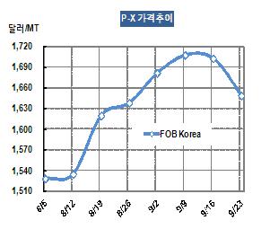 P-X 가격은 9월23일 FOB Korea 톤당 1649달러로 54달러 급락했다.