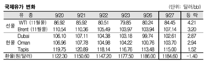 9월27일 국제유가는 유럽경기 회복에 대한 기대감 상승으로 강세를 나타낸 것으로 해석된다. 표, 그래프: < 국제유가 변화 > <화학저널 2011/09/28> |