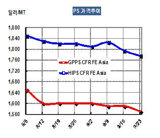 GPPS 가격은 9월21일 CFR FE Asia 톤당 1570달러로 20달러 하락했다.
