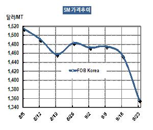 SM 가격은 9월23일 FOB Korea 톤당 1356달러로 98달러 폭락했다.