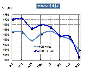 벤젠 가격은 9월23일 FOB Korea 톤당 1040달러로 63달러 급락했다.