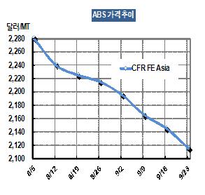 ABS 가격은 9월21일 CFR FE Asia 톤당 2115달러로 30달러 하락했다.