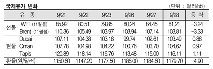9월28일 WTIㆍBrent 3달러 이상 급락 … 두바이유는 상승