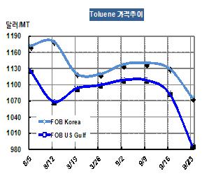톨루엔 가격은 9월23일 FOB Korea 톤당 1076달러로 54달러 급락했다.