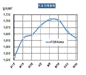 P-X 가격은 9월30일 FOB Korea 톤당 1620달러로 29달러 하락했다.