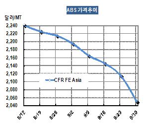 ABS 가격은 9월28일 CFR FE Asia 톤당 2050달러로 65달러 폭락했다.
