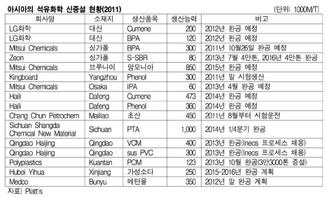 중국의 Kingboard Chemical은 Yangzhou 소재 페놀 30만톤 플랜트를 2011년 12월 말 완공해 시험가동에 들어갈 것으로 알려졌다. 표, 그래프: < 아시아의 석유화학 신증설 현황(2011) > <화학저널 2011/10/06> |