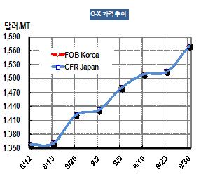 O-X 가격은 9월30일 FOB Korea 톤당 1570달러로 55달러 급등했다.
