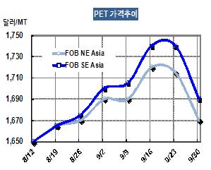 PET 칩 가격이 9월28일 FOB NE Asia 톤당 1670달러로 45달러 하락했다.