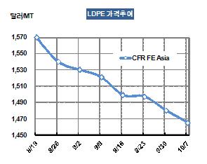 LDPE 가격은 10월5일 CFR FE Asia 톤당 1465달러로 15달러 하락했다.
