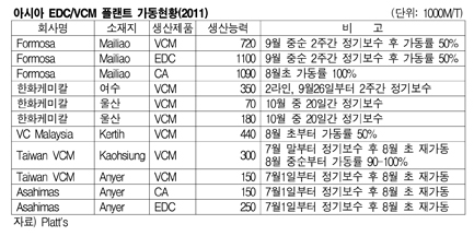 그러나 9-10월 정기보수가 이어지고 있어 공급에는 큰 변동이 없을 것으로 예상된다. 표, 그래프: < 아시아 EDC/VCM 플랜트 가동현황(2011) > <화학저널 2011/10/10> |