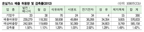 정부는 제도 시행 첫 해인 점을 감안해 사후관리 방안도 함께 추진하기로 했다. 표, 그래프: < 온실가스 배출 허용량 및 감축률(2012) > <화학저널 2011/10/10> |