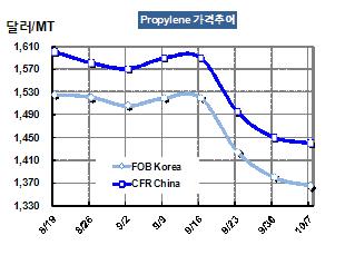 프로필렌 가격은 10월7일 FOB Korea 톤당 1365달러로 15달러 하락했다.
