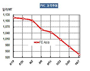 PVC 가격은 10월5일 CFR FE Asia 톤당 935달러로 35달러 급락했다.