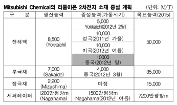 표, 그래프: < Mitsubishi Chemical의 리튬이온 2차전지 소재 증설 계획 > <화학저널 2011/10/12> |