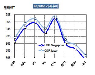 나프타 가격은 10월7일 CFR Japan 톤당 872달러로 29달러 하락했다.