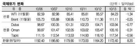 10월13일 국제유가는 중국의 석유 수요 증가율 둔화 및 미국의 원유 재고 증가에 따라 하락한 것으로 해석된다. 표, 그래프: < 국제유가 변화 > <화학저널 2011/10/14> |