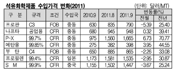 표, 그래프: < 석유화학제품 수입가격 변화(2011) > <화학저널 2011/10/17> |