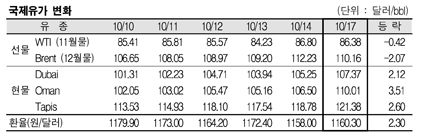 10월17일 국제유가는 유럽 재정위기에 대한 우려감이 확대되면서 하락한 것으로 해석된다. 표, 그래프: < 국제유가 변화 > <화학저널 2011/10/18> |