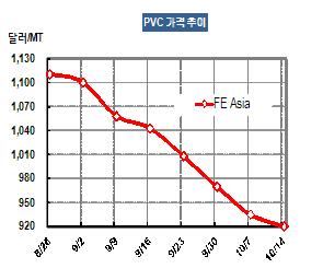 PVC 가격은 10월12일 CFR FE Asia 톤당 920달러로 15달러 하락했다.