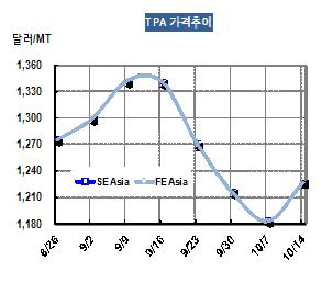 PTA 가격은 10월14일 CFR China/Southeast Asia 톤당 1227달러로 44달러 상승했다.