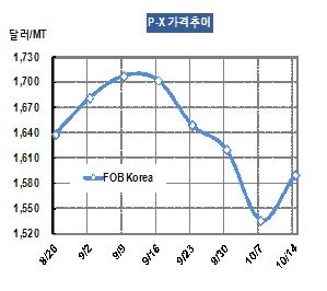 P-X 가격은 10월14일 FOB Korea 톤당 1590달러로 54달러 급등했다.
