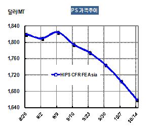 HIPS는 대체관계에 있는 ABS(Acrylonitrile Butadiene Styrene) 수요가 크게 줄어든 영향으로 받아 수요가감소하고 있다. 표, 그래프: < PS 가격추이 > <화학저널 2011/10/20> |